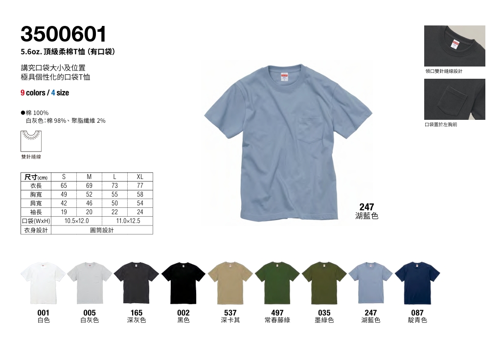 【純棉】United Athlte 3500601 5.6oz. 頂級柔棉T恤(有口袋)