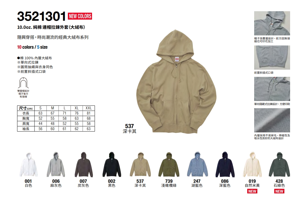 【純棉】United Athlte 3521301 10.0oz. 純棉拉鏈外套(大絨布)